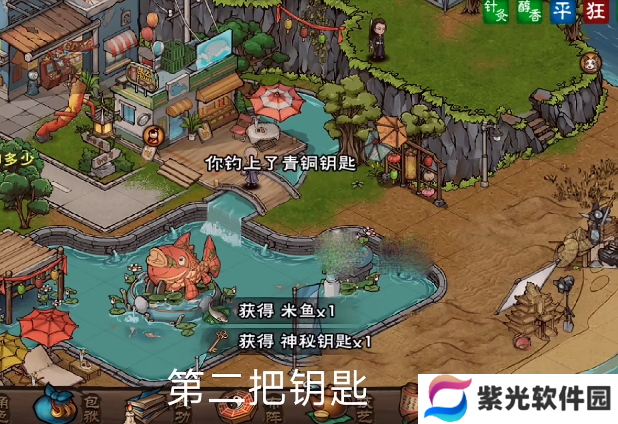 2、第二把钥匙:(23,19)找红鲤鱼打听,需要20鱼饵,给它之后在(25,14)面朝鲤鱼钓鱼,获得第二把钥匙