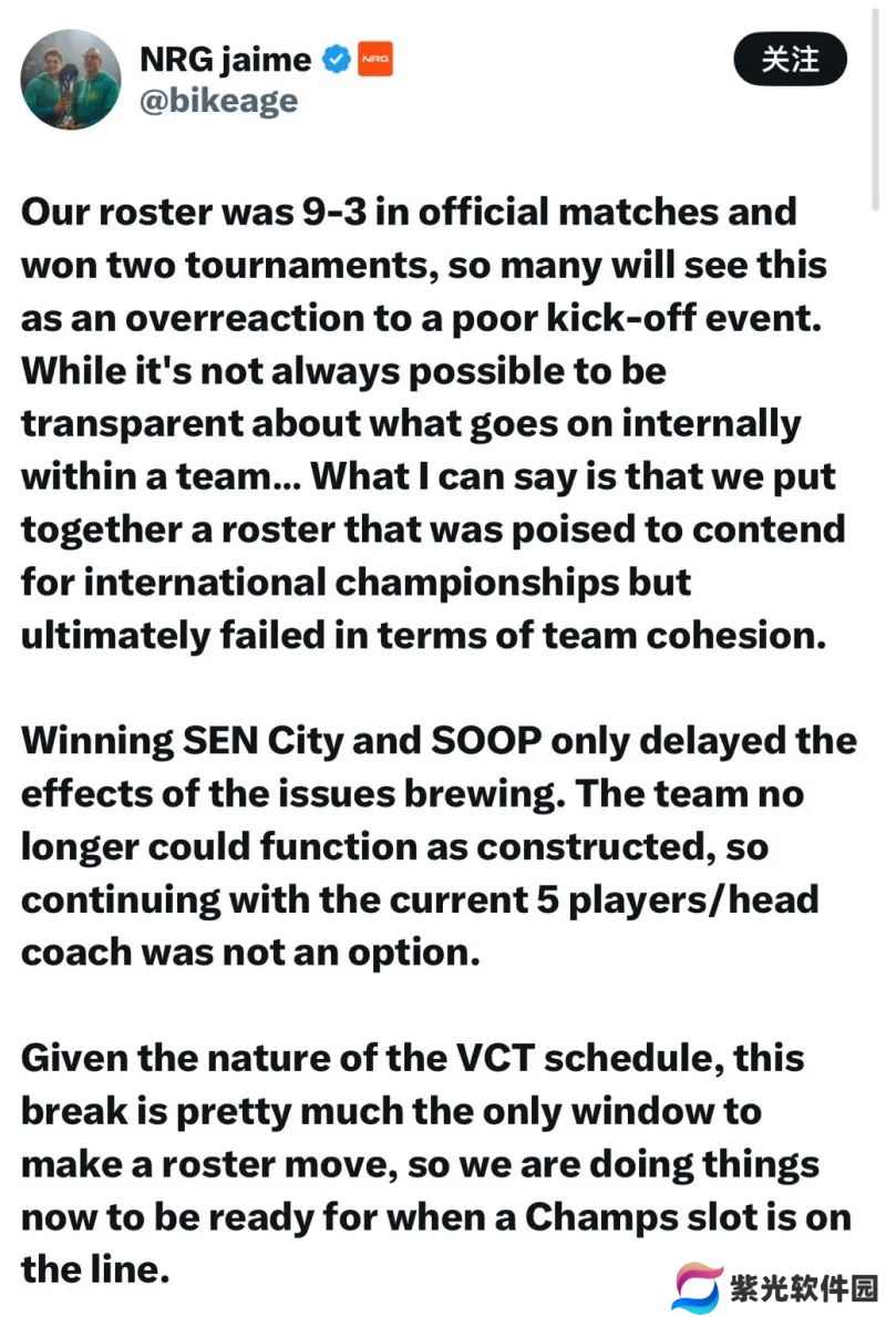 NRG的CGO在社交媒体上谈及调整的原因,他表示,尽管队伍在正式比赛中取得了9胜3负的成绩,并赢得了两项赛事冠军,但内部仍然存在团队凝聚力的问题。他指出,赢下SEN City和SOOP赛事仅是延缓了问题的爆发,而当前的阵容已无法继续运作,因此管理层决定在VCT赛程的空档期进行调整,以便更好地为后续比赛做准备。