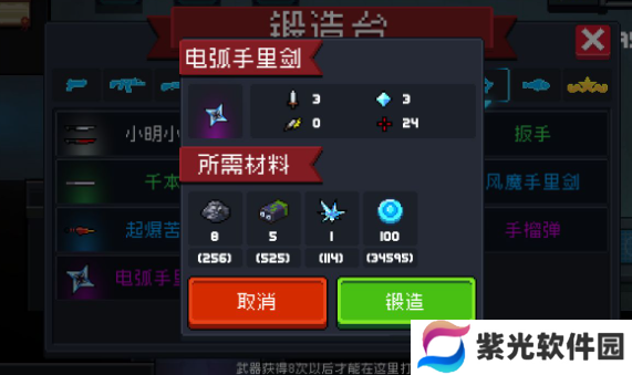 电弧手里剑是一款非常强大的投掷类武器,但是合成出来的效果却不尽人意,所以手里有电弧手里剑碰到雷电战锤不要手*合成