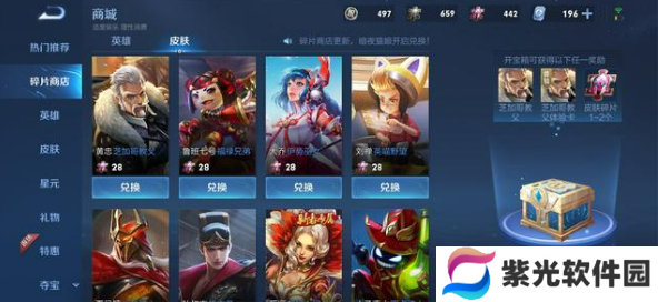 3、皮肤碎片大约15-30天更新一次,更新过后皮肤碎片商城中全部的英雄以及皮肤都会更新;