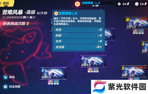 苦难风暴关卡设有多个不同难度的点位和特殊的能量增幅系统,每次通关点位后可积累能量,从而提升能量增幅效果的等级,增强关卡内的增益效果和女武神能力,助力舰长挑战较高难度的关卡。