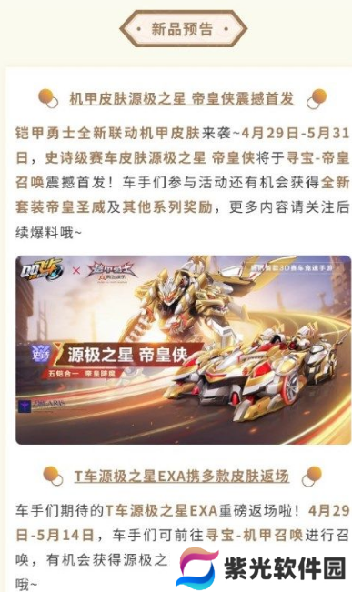 《QQ 飞车手游》宣布与铠甲勇士合作,史诗级赛车皮肤源极之星帝皇侠将于 4 月 29 日-5 月 31 日推出,官方还放出了首段 CG。玩家参与活动还有机会获得全新套装帝皇圣威及其他系列奖励。