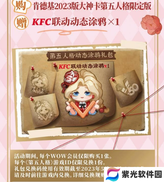 九、开通【肯德基2023版大神卡第五人格限定版(90天)】后,可在“第五人格”微信公众号或《第五人格》游戏内兑换“第五人格动态涂鸦礼包”1份。用户可于2023年5月10日23:59之前前往大神卡主题页【专享福利】权益池查看对应权益,点击“立即领取”可前往WOW会员卡包查看“第五人格动态涂鸦礼包”兑换券1张。兑换券使用有效期截至2023年5月10日23:59。在使用有效期内,关注“第五人格”微信公众号,点击底部菜单【事务所】后选择【许愿兑换】即可进入兑换页面,按页面提示使用兑换码兑换礼包;或登录《第五人格》游戏,进入许愿单页面,按页面提示使用兑换码兑换礼包。活动期间,每个《第五人格》游戏ID仅限兑换1份“第五人格动态涂鸦礼包”。“第五人格动态涂鸦礼包”权益由《第五人格》游戏提供,权益具体内容说明及使用规则以游戏平台官方公示为准。