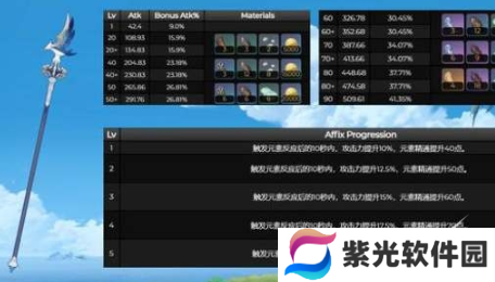2、武器属性:基础属性提升攻击力以及百分比攻击力,武器特效触发触发元素反应后的10秒内自身提升10%攻击力和40点元素精通属性;