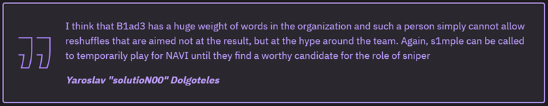 他还提到,B1ad3不会允许NAVI签下s1mple来增加“炒作”,而不是为了结果: