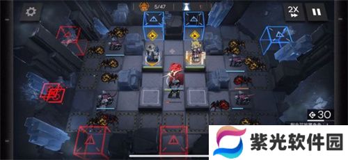 2.28/47波次,成队源石虫和无人机移动到右侧时,开启空和梅尔的技能,在此之前左侧需要一个水獭阻挡敌人并吸引无人机火力,右侧则需要部署三个水獭。