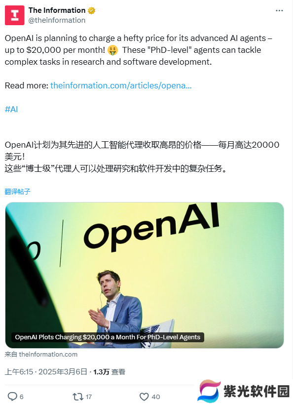 本站 3 月 6 日消息,The Information 今日报道称,OpenAI 将推出一款“达到博士水平”的 AI 智能体(Agent),最高每月收费 2 万美元(本站备注:当前约 14.5 万元人民币)。