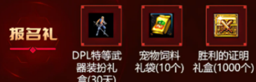 格斗大赛报名则可以获得DPL特等武器装扮礼盒30天+宠物饲料礼10个+胜利的证明1000个。
