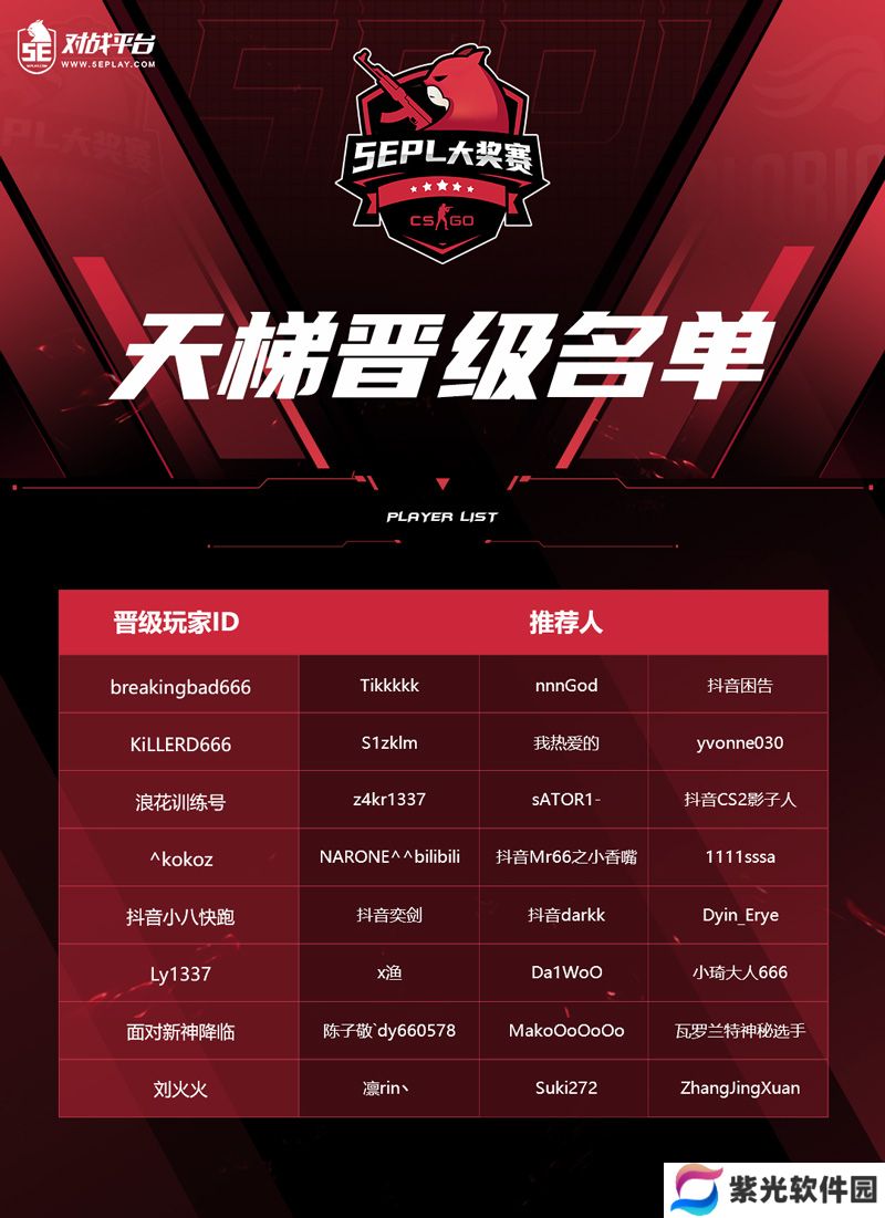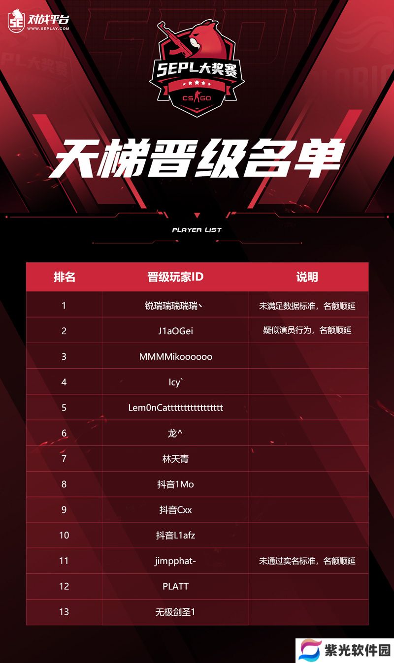 该渠道晋级名单来自于2024 S5赛季天梯TOP10。晋级选手需接受5EPL官方审核,未通过审核或已有5EPL资格的选手,其5EPL资格将顺延发放。