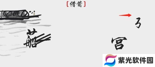 1、【借箭】首先按住【船】字,往右可以拉长;2、用拉长的船钩将【营】字的草字头勾过来,草字头就到了船上,变成了草船;3、接着点击右边的弓,弓箭就会射到船上,成功完成借箭。