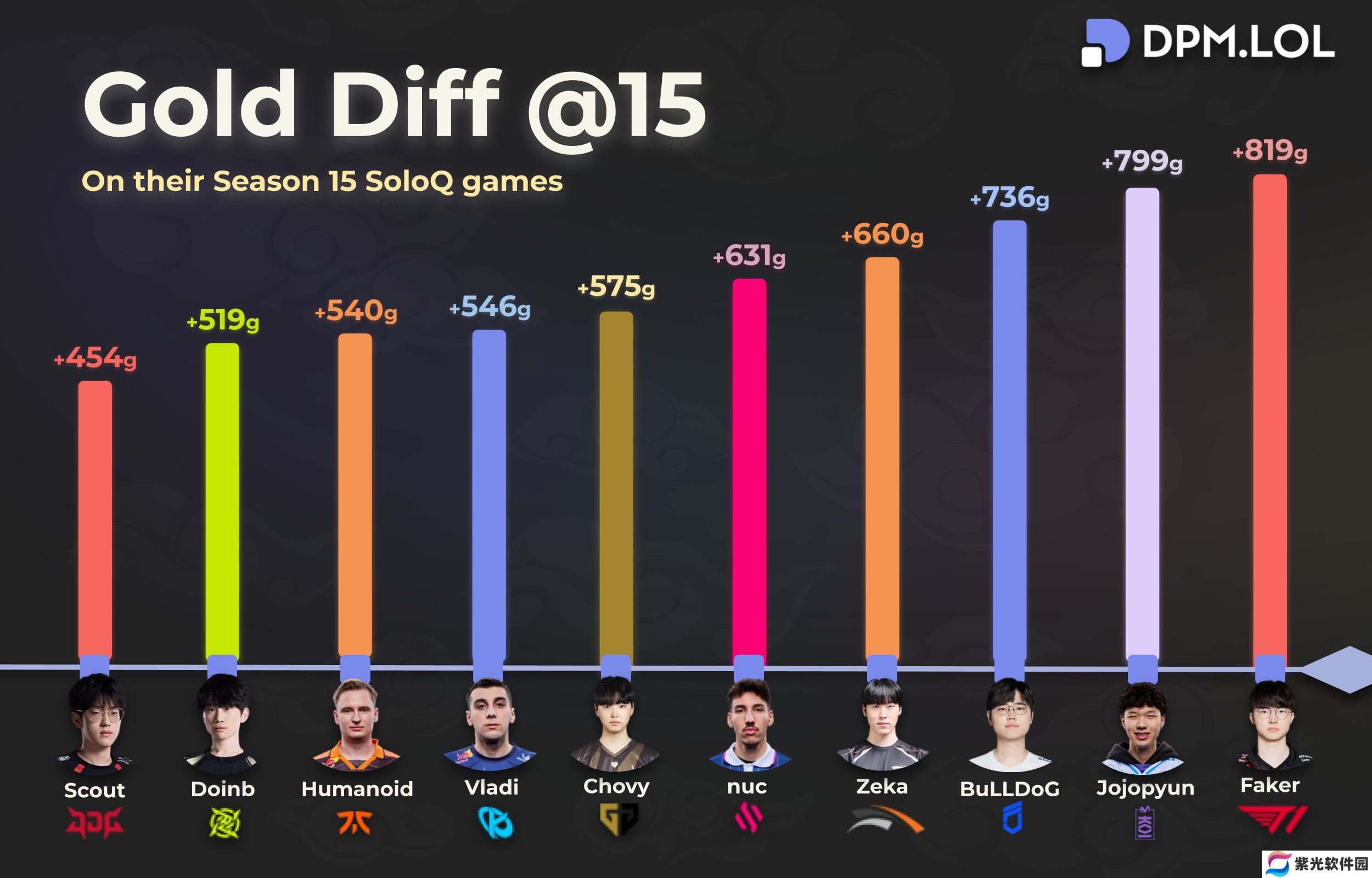 今日有外媒了统计各大联赛的十五分钟经济差数据的中单前十名,其中T1中单Faker以819是前十五分钟经济差力压群雄。而LPL仅有NIP中单Doinb和JDG中单Scout位列第九、第十。