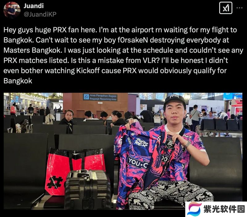 嘿,大家好,我是PRX的超级粉丝。我现在正在机场,等我的飞往曼谷的航班。已经迫不及待想看我兄弟f0rsakeN在曼谷大师赛上碾压所有人了。我刚看了下赛程表,发现上面没有列出PRX的比赛。这是VLR的失误吗?