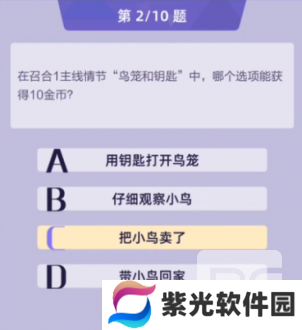 2、在召合1主线情节“鸟笼和钥匙”中,哪个选项能获得10金币?