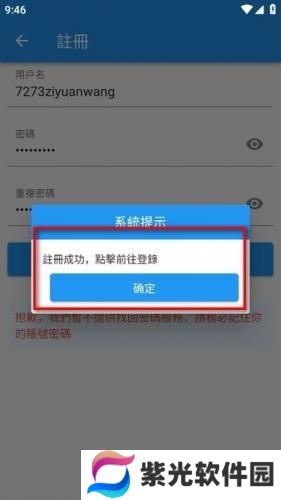 如果用户名和密码符合要求,弹出窗口提示“注册成功,点击登录”。